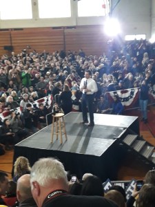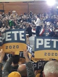 middelbare school in Nashua, in het zuiden van de staat, is tot de nok toe gevuld. Er stonden 1700 tot 1800 mensen buiten in de rij. Die konden nooit allemaal in de sportzaal terecht. Buttigieg is populair en een rijzende ster. De menigte is uitzinnig en er zijn zelfs mensen uit staten als Massachusetts gekomen om naar Buttigieg te luisteren.